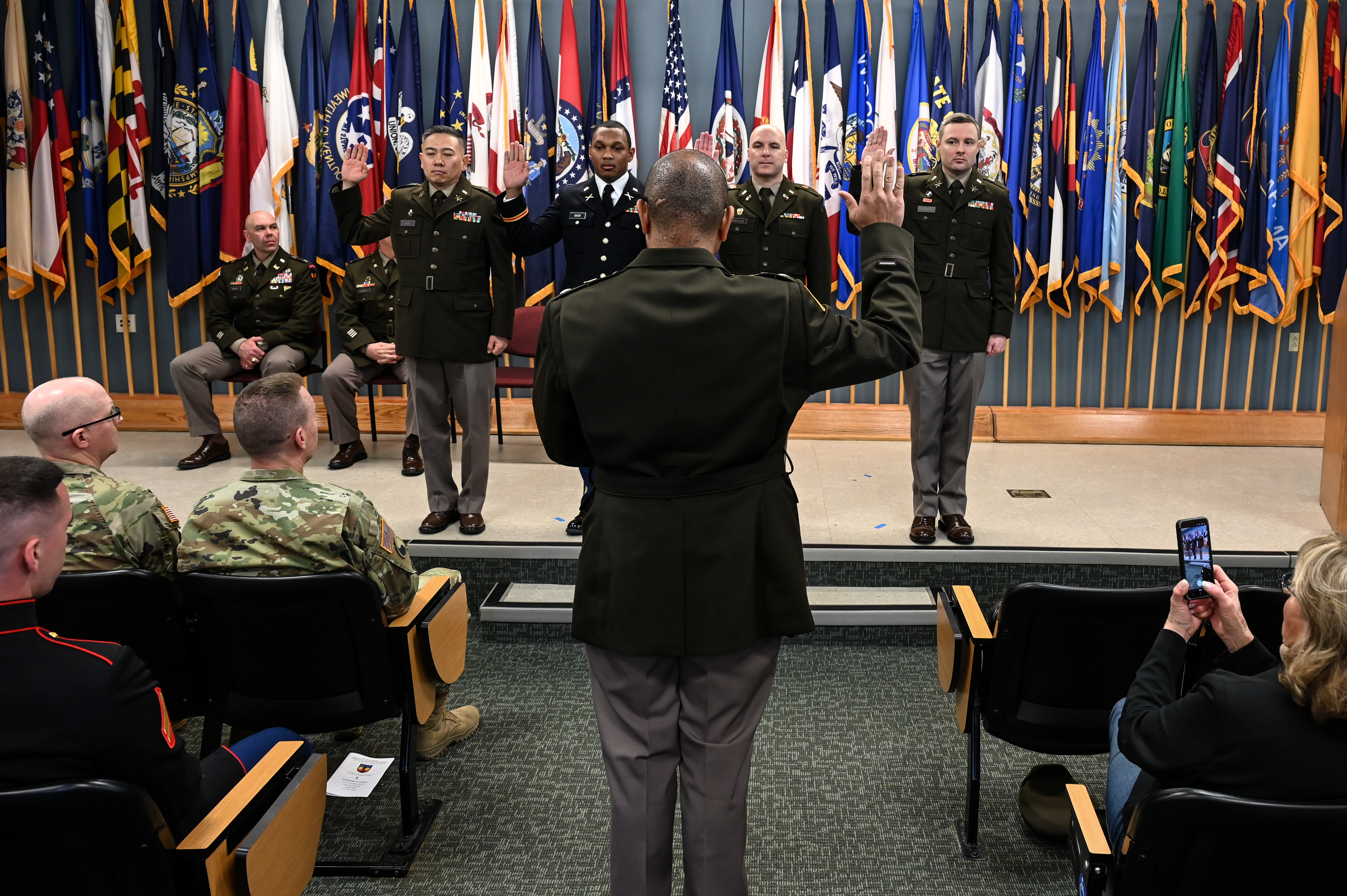 Following Mason’s remarks, the four officer candidates stepped forward and, as Kelso administered the oath of office, raised their right hands and swore to support and defend the Constitution of the United States and the Constitution of Virginia. They were then pinned with their new rank by family members and friends and received their first salute from an enlisted service member.