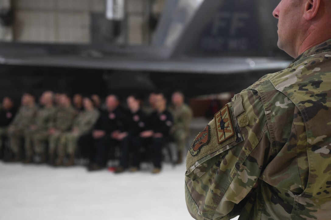 Members of the 192nd Wing, Virginia Air National Guard, attend a Dedicated Crew Chief Ceremony Nov. 26, 2024, at Joint Base Langley-Eustis in Hampton, Virginia. The ceremony formally recognized Airmen selected as DCC’s being entrusted to assume responsibility for their F-22 Raptor aircraft. (U.S. Air National Guard Photo by Staff Sgt. Nilsa Garcia)