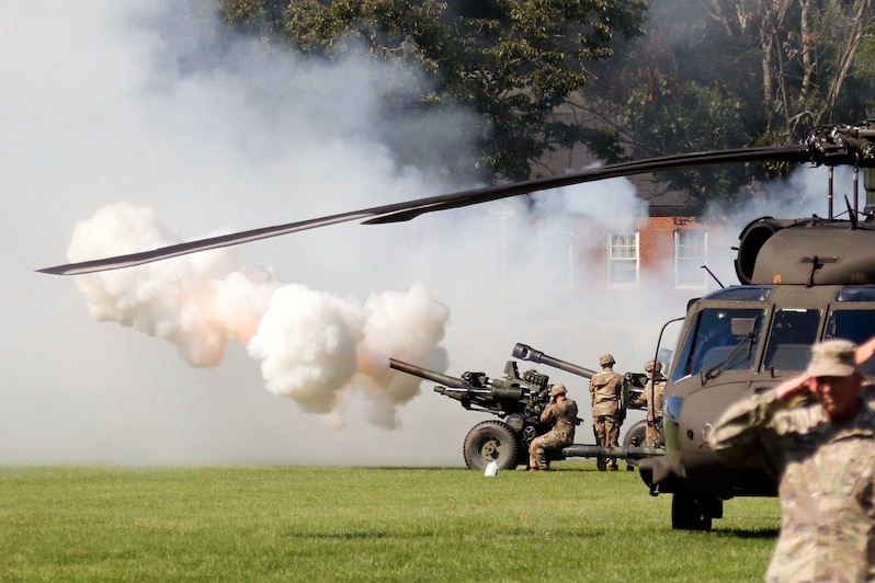 Brig. Gen. Christopher J. Samulski takes command of the Fort Belvoir-based 29th Infantry Division from Maj. Gen. Joseph A. DiNonno during a ceremony Aug. 3, 2025, at Fort Belvoir, Virginia. Maj. Gen. James W. Ring, the Adjutant General of Virginia, presided over the exchange of organizational colors representing the transfer of command from DiNonno to Samulski. Command Sgt. Maj. Eric J. Saxton, the 29th senior enlisted leader, was keeper of the colors for the ceremony. The Troutville-based 29th Infantry Division Band provided music for the event. The Sandston-based 2nd Battalion, 224th Aviation Regiment conducted a flyover with four Black Hawk helicopters and the Norfolk-based 1st Battalion, 111th Field Artillery Regiment fired an honor salute.