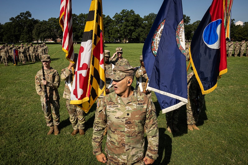 Brig. Gen. Christopher J. Samulski takes command of the Fort Belvoir-based 29th Infantry Division from Maj. Gen. Joseph A. DiNonno during a ceremony Aug. 3, 2025, at Fort Belvoir, Virginia. Maj. Gen. James W. Ring, the Adjutant General of Virginia, presided over the exchange of organizational colors representing the transfer of command from DiNonno to Samulski. Command Sgt. Maj. Eric J. Saxton, the 29th senior enlisted leader, was keeper of the colors for the ceremony. The Troutville-based 29th Infantry Division Band provided music for the event. The Sandston-based 2nd Battalion, 224th Aviation Regiment conducted a flyover with four Black Hawk helicopters and the Norfolk-based 1st Battalion, 111th Field Artillery Regiment fired an honor salute.
