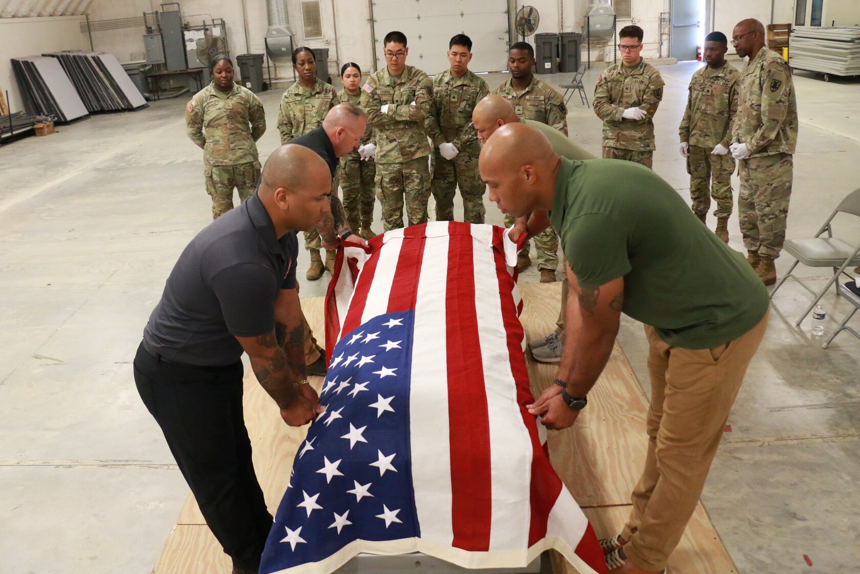 Soldiers assigned to the Virginia Army National Guard Funeral Honors Program provide funeral honors training to active-duty Soldiers assigned to the Joint Base Langley-Eustis-based 7th Transportation Brigade Sept. 3, 2025, at the State Military Reservation in Virginia Beach, Virginia. The MFH Program Soldiers provided two separate, week-long training iterations to two groups of 7th Transportation Brigade Soldiers Aug. 25 – Sept. 5, 2025. The Virginia Guard MFH Program hosts several training courses for Soldiers from around the country throughout the year. The program is composed of four teams located throughout the state which provide funeral details, not just to National Guard Soldiers, but to veterans of the active Army, Army Reserve and Army National Guard. They have performed more than 26,866 funeral services throughout the Commonwealth and average 150 services each month. (U.S. National Guard photo by A.J. Coyne)