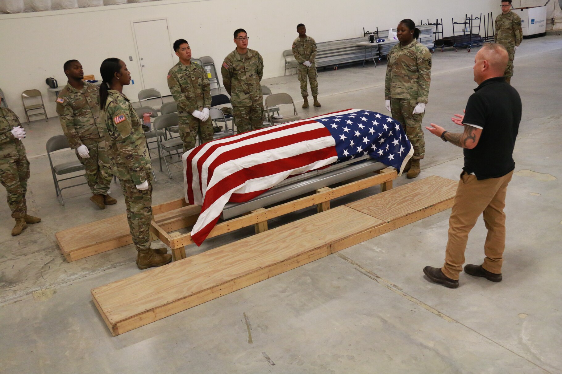 Soldiers assigned to the Virginia Army National Guard Funeral Honors Program provide funeral honors training to active-duty Soldiers assigned to the Joint Base Langley-Eustis-based 7th Transportation Brigade Sept. 3, 2025, at the State Military Reservation in Virginia Beach, Virginia. The MFH Program Soldiers provided two separate, week-long training iterations to two groups of 7th Transportation Brigade Soldiers Aug. 25 – Sept. 5, 2025. The Virginia Guard MFH Program hosts several training courses for Soldiers from around the country throughout the year. The program is composed of four teams located throughout the state which provide funeral details, not just to National Guard Soldiers, but to veterans of the active Army, Army Reserve and Army National Guard. They have performed more than 26,866 funeral services throughout the Commonwealth and average 150 services each month. (U.S. National Guard photo by A.J. Coyne)