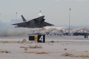 An F-22A Raptor from Joint Base Langley-Eustis, Va., takes off during the 40th anniversary of the Red Flag combat training exercise, Red Flag 15-1 at Nellis Air Force Base, Nev., Feb. 3, 2015. Red Flag is a realistic combat training exercise designed to simulate the first few weeks of a major theater campaign involving air, space and cyber forces of the U.S. and its allies. It is conducted on the bombing and gunnery ranges on the Nevada Test and Training Range. (U.S. Air National Guard photo by Master Sgt. Carlos J. Claudio)