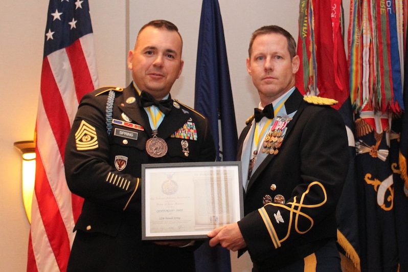Command Sgt. Maj. Donald Spring Jr., the senior enlisted leader for the Fredericksburg-based 229th Brigade Engineer Battalion, received the Order of Saint Maurice from Col. Arthur Moore, commander of the 116th Mobile Brigade Combat Team Nov. 8, 2025, in Staunton, Virginia. The award is given to individuals who demonstrate the highest standards of integrity, moral character, professional competence and have made significant contributions to the U. S. Army Infantry.