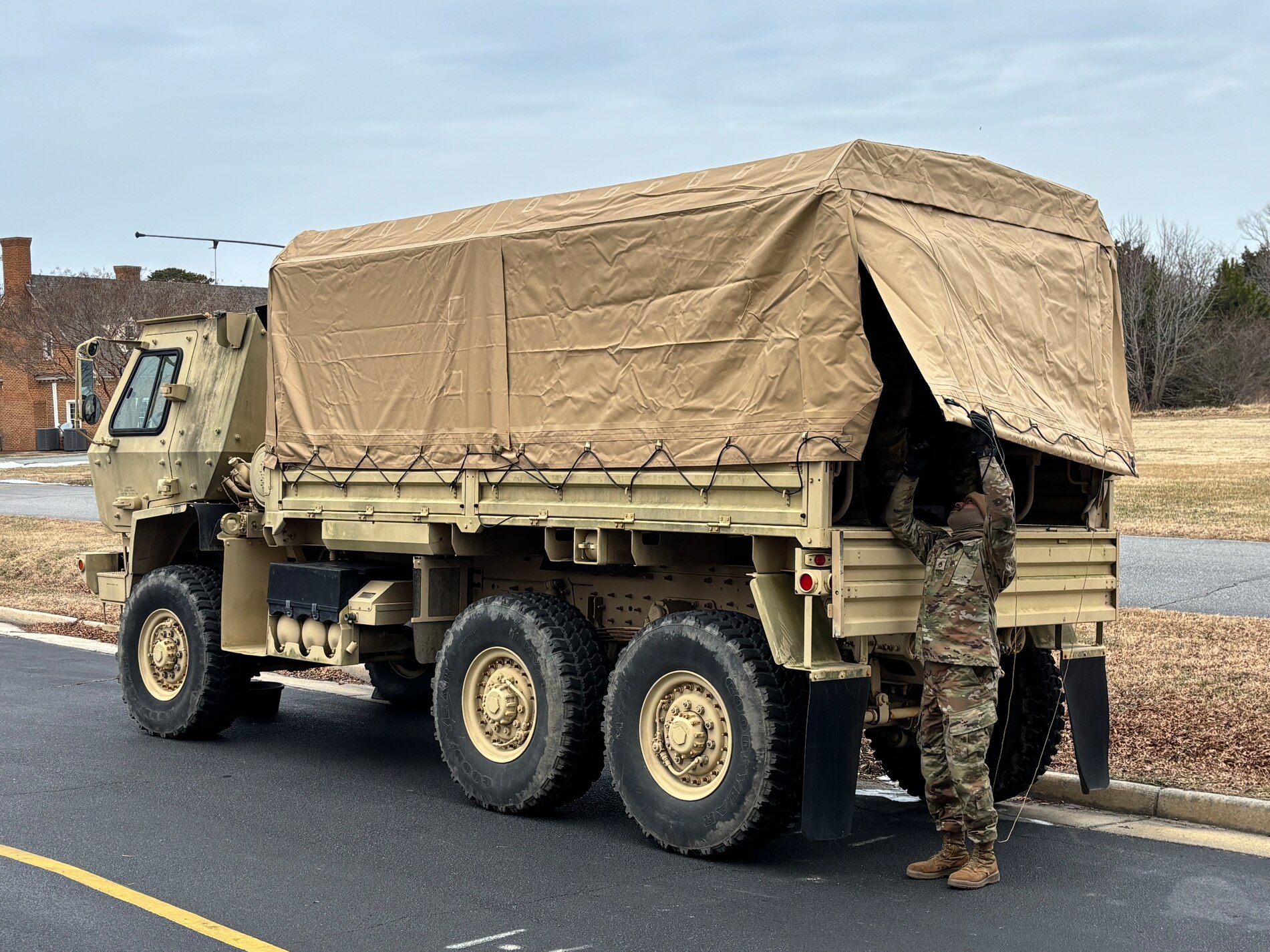 Virginia National Guard Airmen prepare for possible snow response missions on the Eastern Shore Jan. 31, 2026, in Exmore, Virginia. VNG Soldiers and Airmen are staged and ready Jan. 31, 2026, primarily in Hampton Roads and the Eastern Shore regions, to support the response to snow expected to impact parts of Virginia. Approximately 130 VNG personnel are on duty, including response teams, command and control, administrative and logistics resources and other support elements. Members of the Virginia Defense Force are also supporting response operations. VNG crews will coordinate with regional emergency managers in their staging locations to conduct missions and provide assistance as needed beginning Jan. 31. VNG troops are organized in multifunctional teams capable of reducing debris to help clear roads and power line routes and move commodities. Troops also have heavy duty tactical trucks capable of traveling through deep snow or high water. Black Hawk helicopters with rescue hoist capabilities are also alerted and on standby.