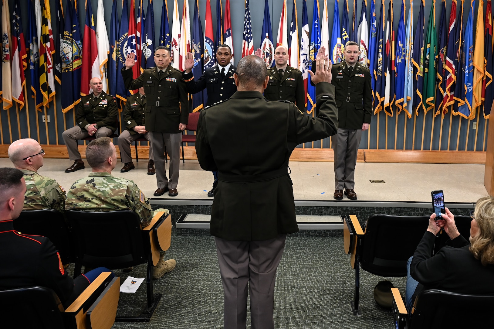 The Virginia National Guard’s Warrant Officer Candidate School celebrates the graduation of four new warrant officers in a ceremony March 8, 2026, at Fort Pickett, Virginia. The candidates took their oath of office and were then pinned with their new rank by family members, friends and mentors. Col. Beau Mason served as the guest speaker for the event. (U.S. Army National Guard photo by Sgt. 1st Class Terra C. Gatti)