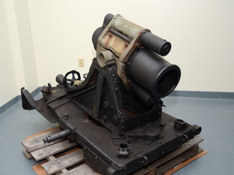Inside the headquarters building, in the corner of the main assembly hall, sits a World War I-era heavy German mortar, Calle a “Minenwerfer.” The weapon was presented to Virginia by the Republic of France as a trophy after World War I. In a strange twist, the mortar was lost after the Petersburg Armory was torn down in the 1960s. It was not found again until 2016, when if was found at a home near Petersburg before it was eventually returned to the Virginia National Guard. The recovery was completed in June 2016 by VNG Soldiers assigned to the Combined Surface Maintenance Shops at DSCR.